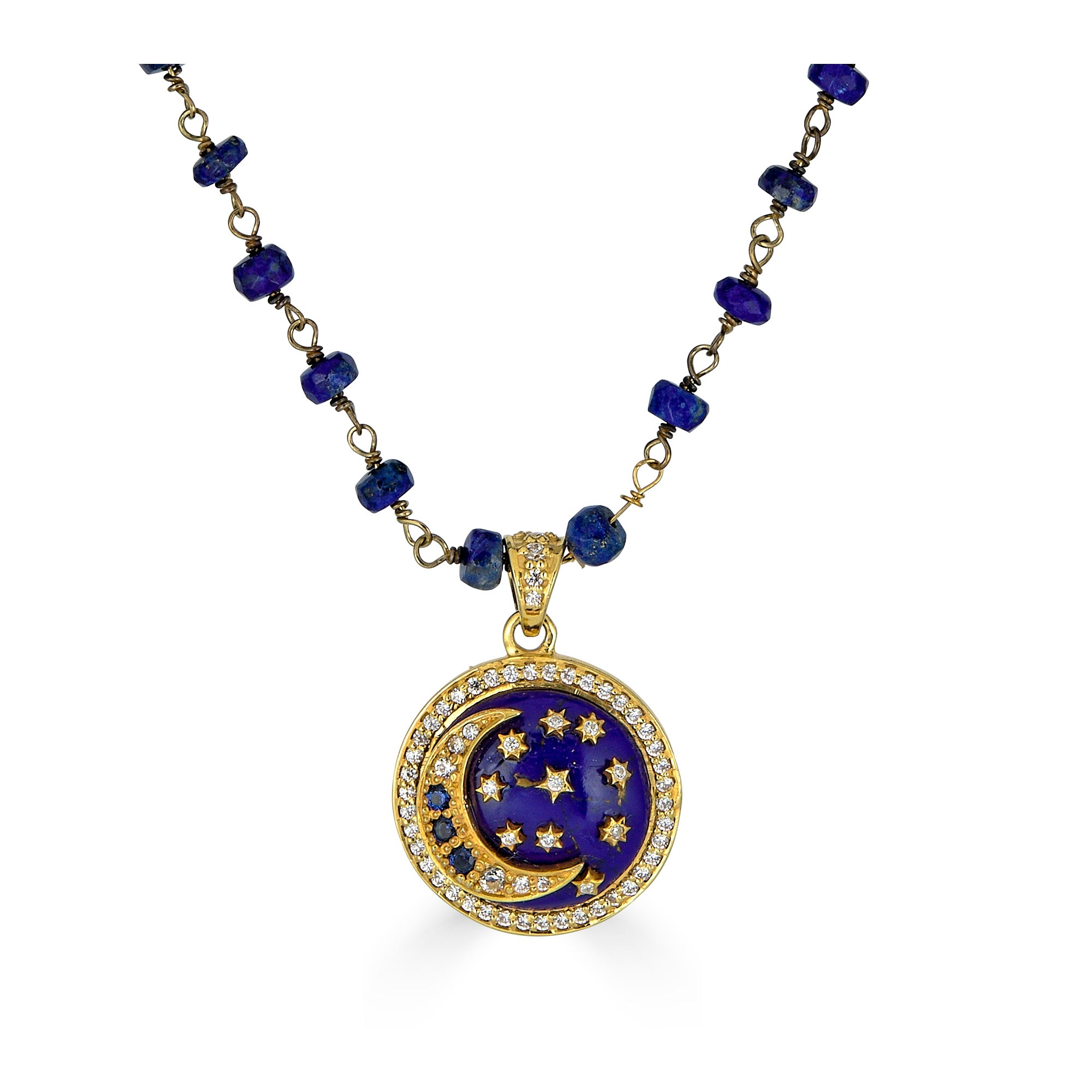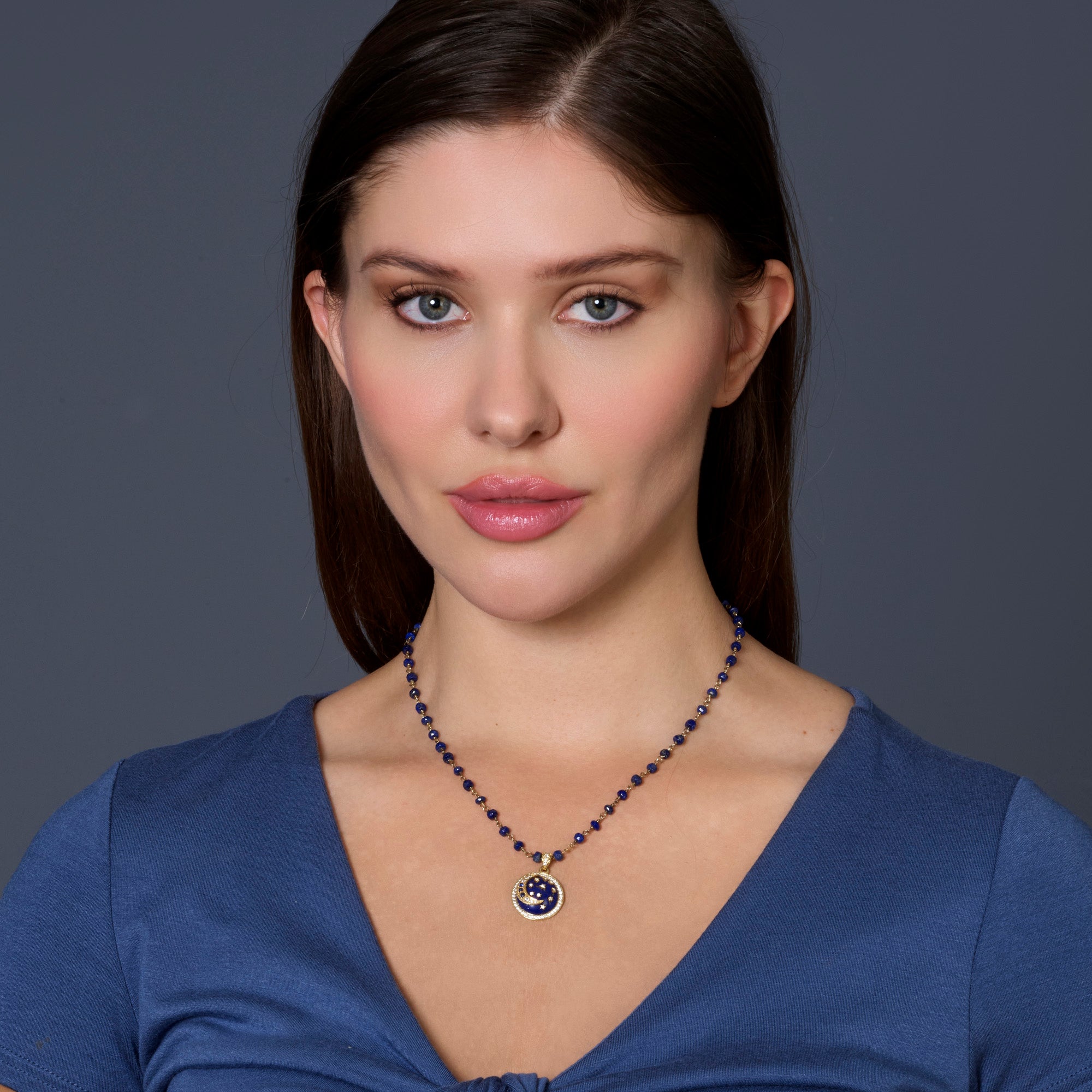 This dreamy pendant necklace features rich blue lapis adorned with a sparkling star and moon motif. Set on a hand-wrapped strand of blue lapis, it’s a celestial-inspired piece that layers beautifully or shines on its own.