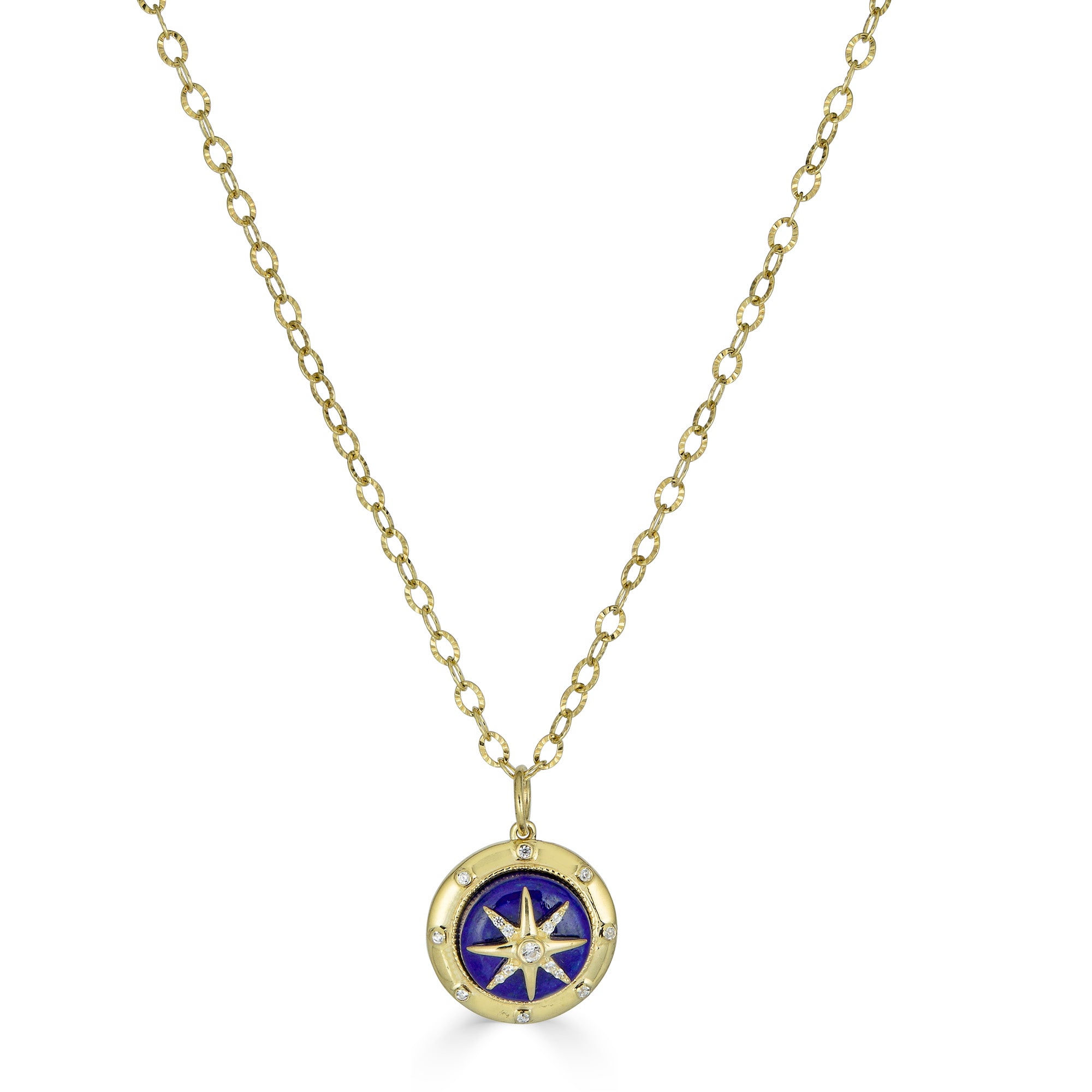 A meaningful everyday necklace featuring a polished blue lapis pendant engraved with a compass design, symbolizing guidance and direction. Set on a delicate gold vermeil chain, this versatile piece adds a touch of celestial charm while remaining lightweight and easy to layer. Perfect for gifting or daily wear.