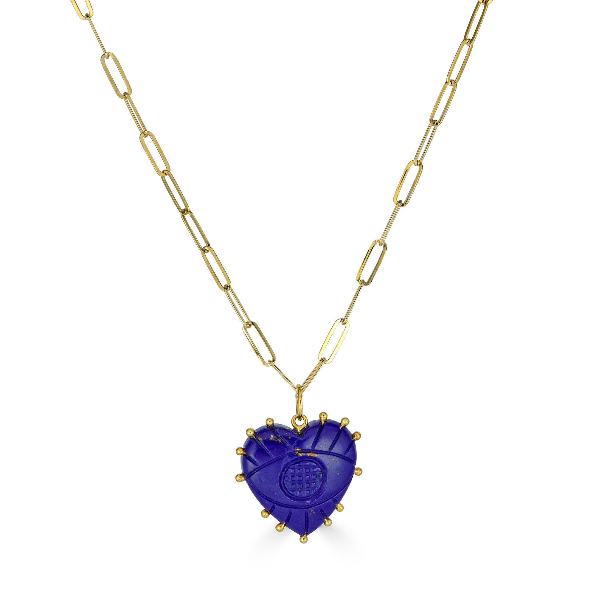 This striking blue lapis heart pendant features a carved protective evil eye motif and delicately hangs from a gold paperclip chain. A perfect blend of natural energy and modern style, this necklace is ideal as a thoughtful gift or a standout piece in your everyday jewelry collection.