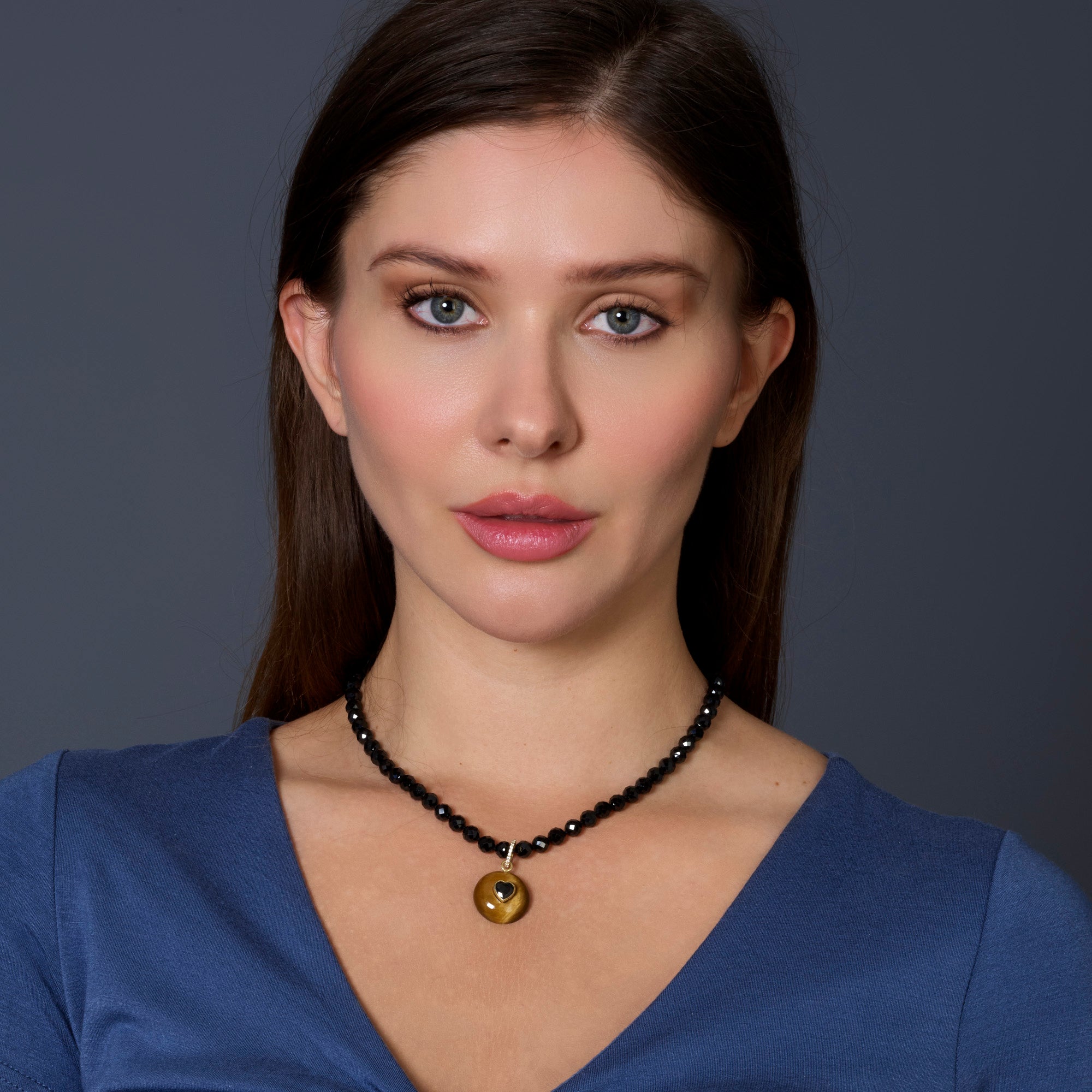 Hand-knotted on silk for elegance and strength, this necklace features faceted black spinel beads paired with a glowing tiger’s eye pendant. A jet-black heart framed in gold sits at the center, creating a striking balance of bold and romantic. A versatile piece that elevates both everyday style and evening looks.
